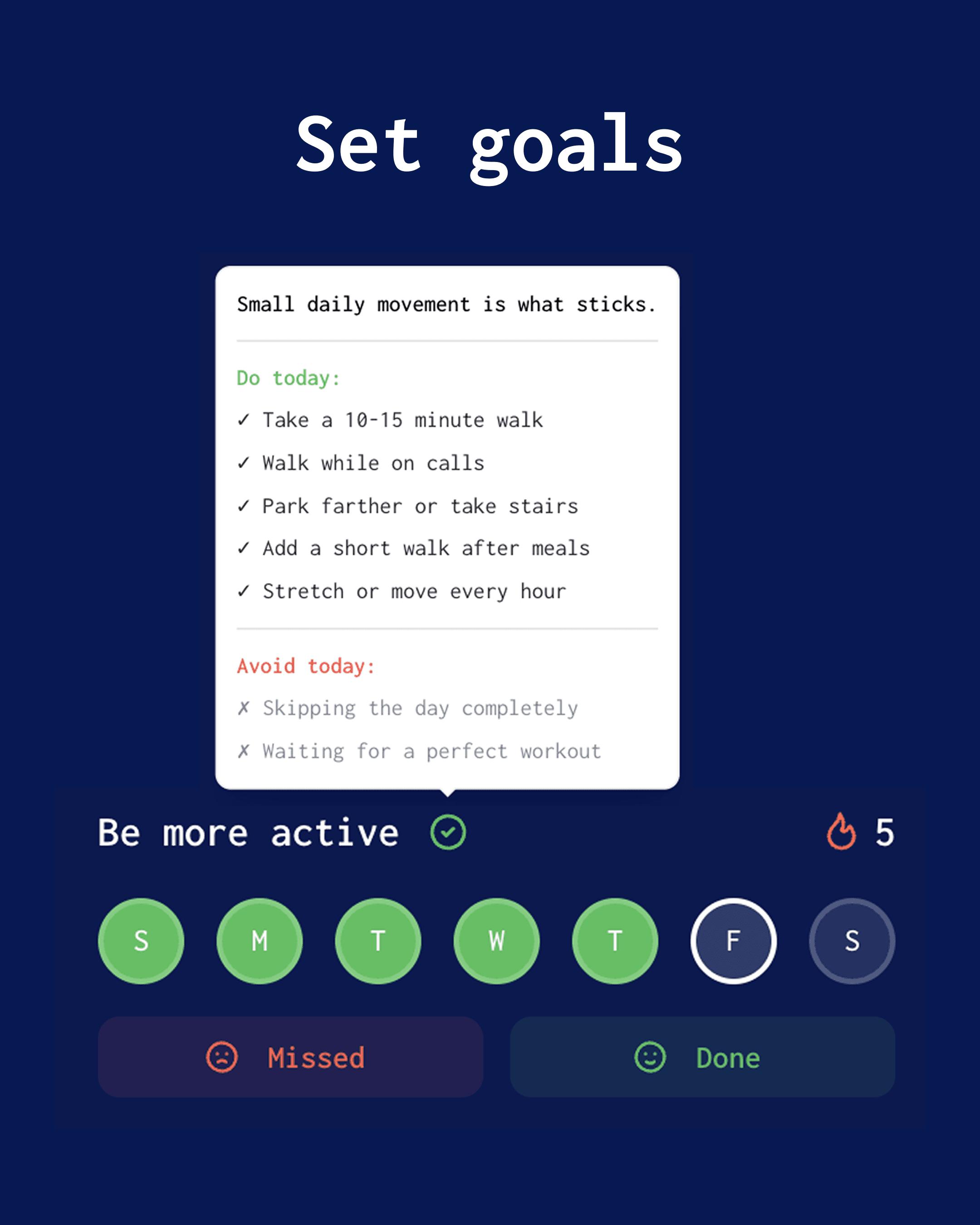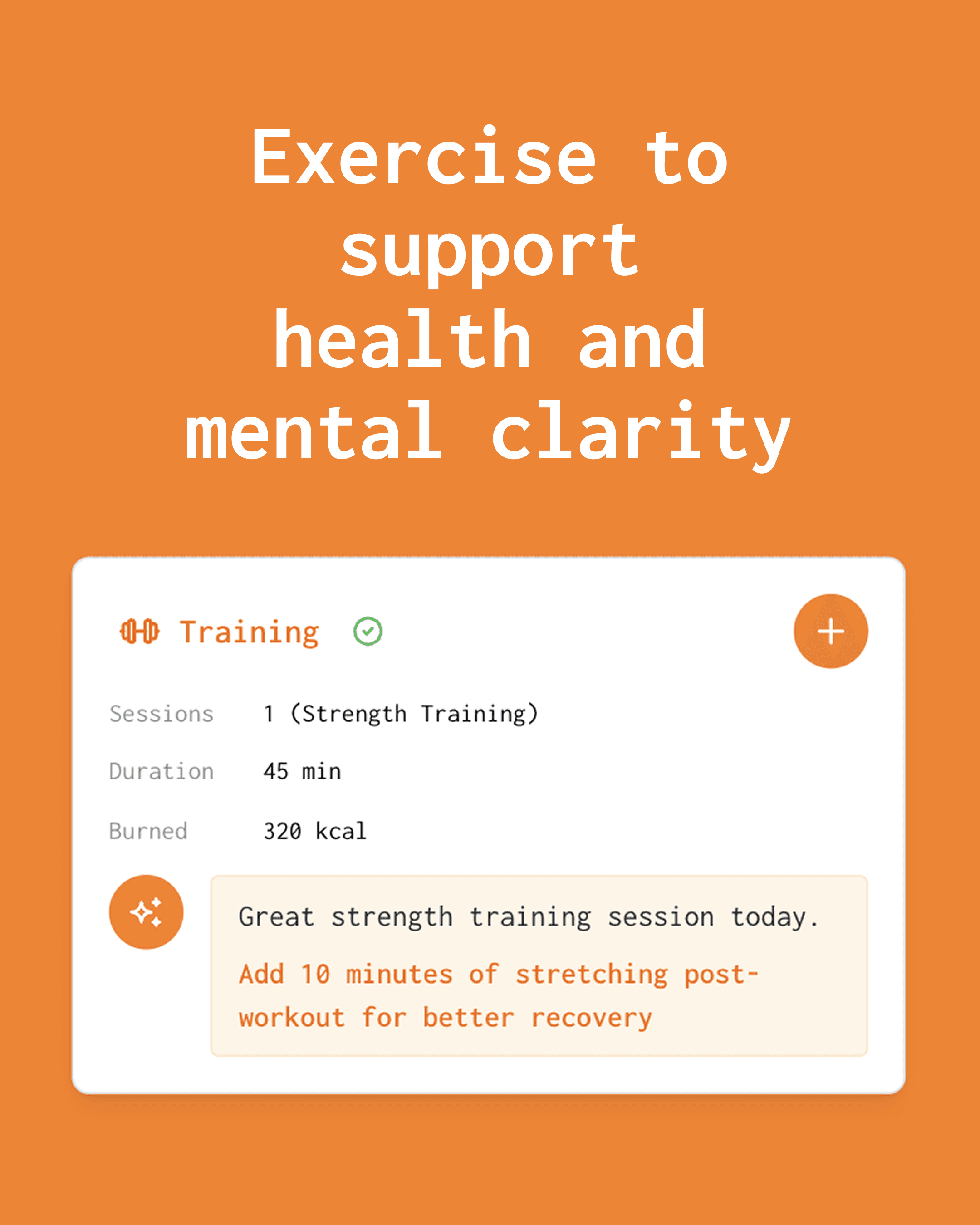 One-minute daily check-ins. Spot patterns between sleep, stress, and productivity that you might miss. If you are feeling down, ask AI Mentor for help.
