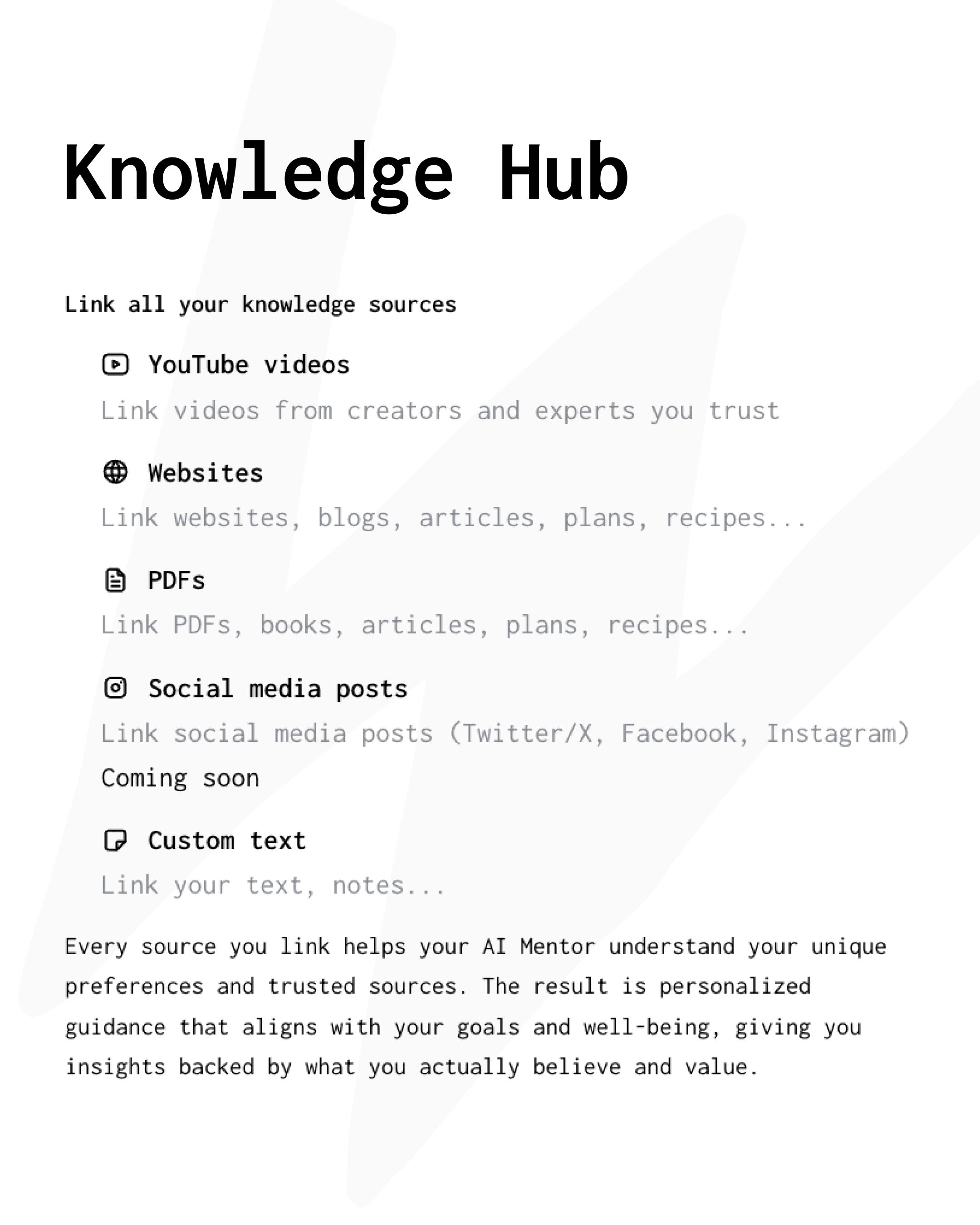 AI Mentor connects your trusted content from YouTube, PDFs, websites and other sources with your daily data to give you the personalized guidance to achieve your goal