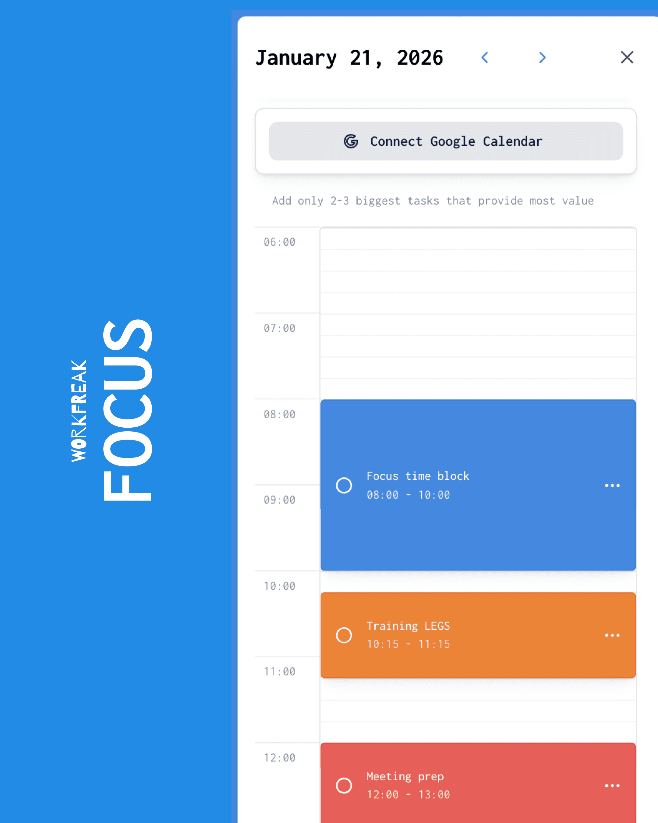 Workfreak is an AI-powered productivity and wellness platform that helps you balance work and life. We believe work shouldn't hurt your health, and your health should support your work. Track everything in one place: time blocking (with Google Calendar sync), nutrition (voice, image, or text), workouts, wellness metrics, and goals. Link your trusted sources in the Knowledge Hub - YouTube videos, PDFs, websites, and custom text. Set goals and log your activities. The AI Mentor then uses your data, goals, and linked knowledge to give you personalized insights and recommendations that actually align with what you believe and value.