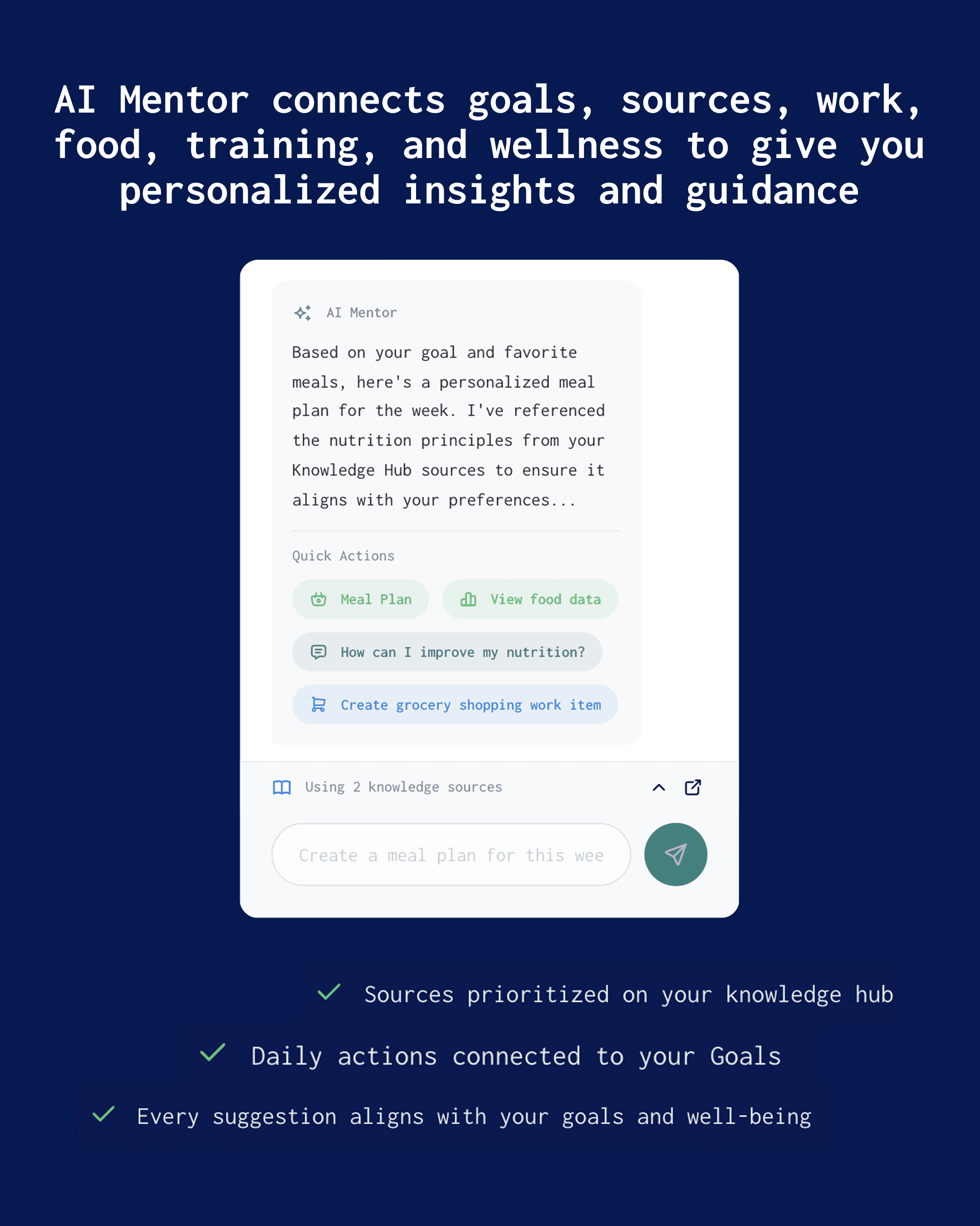 It's simple: Link your trusted sources in the Knowledge Hub (YouTube videos, PDFs, websites, custom text), set goals, and log your daily activities across work, food, training, and wellness. The AI Mentor uses your data, goals, and linked knowledge to provide personalized insights and recommendations. Chat with the AI Mentor anytime or generate insights on demand. Everything connects - your work patterns, nutrition, workouts, sleep, mood, and goals - so you get guidance that's truly personalized to you.